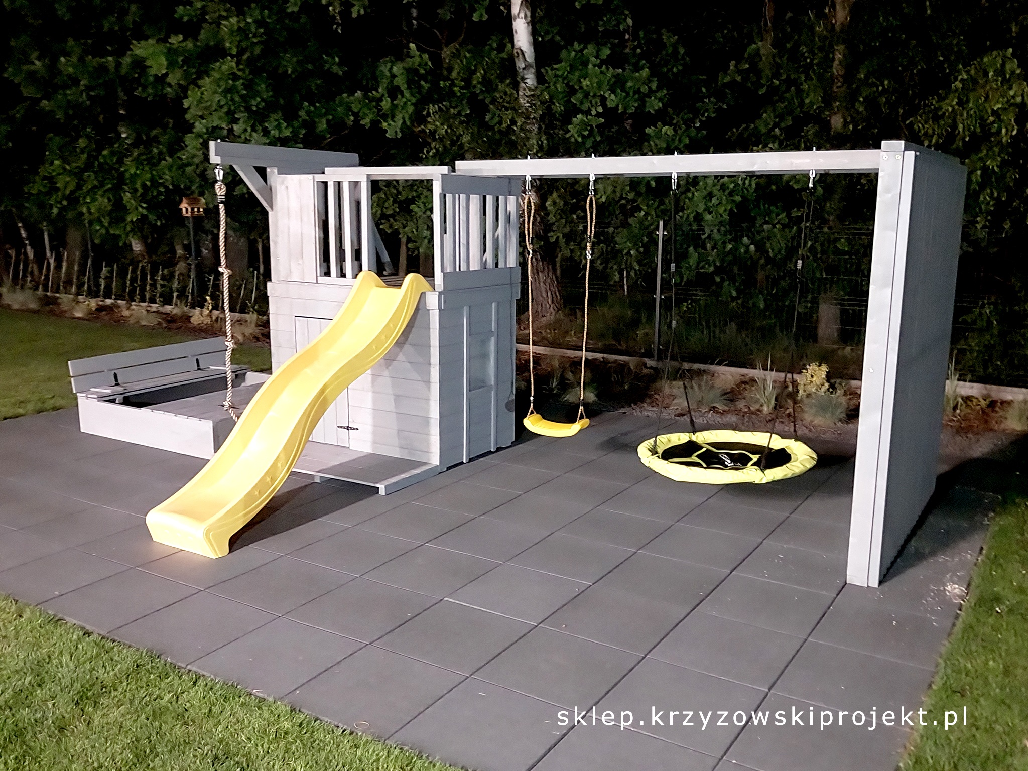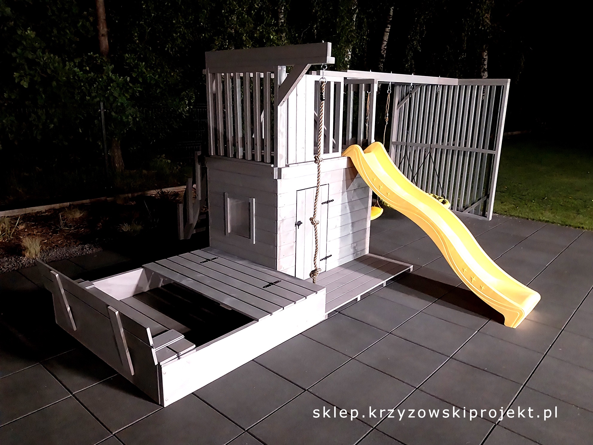 10) Piaskownica – (wys. 2 deski + pokrywa składana na zawiasach – po złożeniu tworzy siedzisko, podłoga drewniana w domku i piaskownicy)